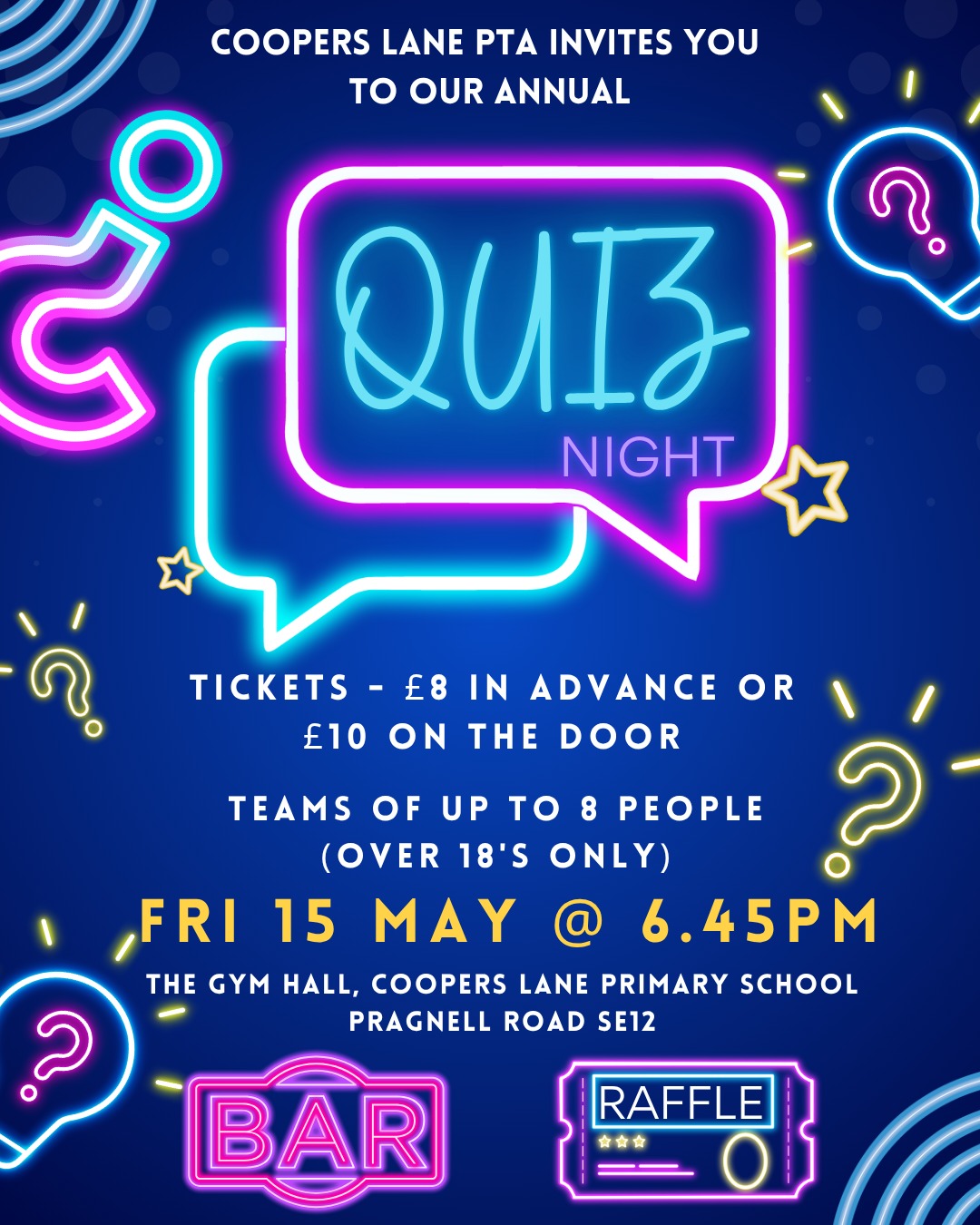 Advance discounted tickets for the Coopers Lane PTA Quiz Night.